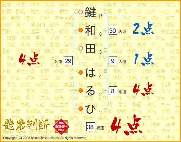 鍵和田はるひさんの総運は38画の4点!