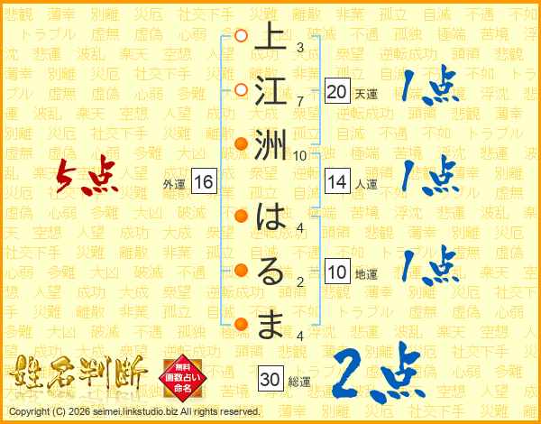 生活面を象徴する運勢です。外部から受ける影響力を表し、結婚運、家庭運や職場、環境への順応性を表します。総運から人運を引いた画数。姓や名が1文字の場合を除く。