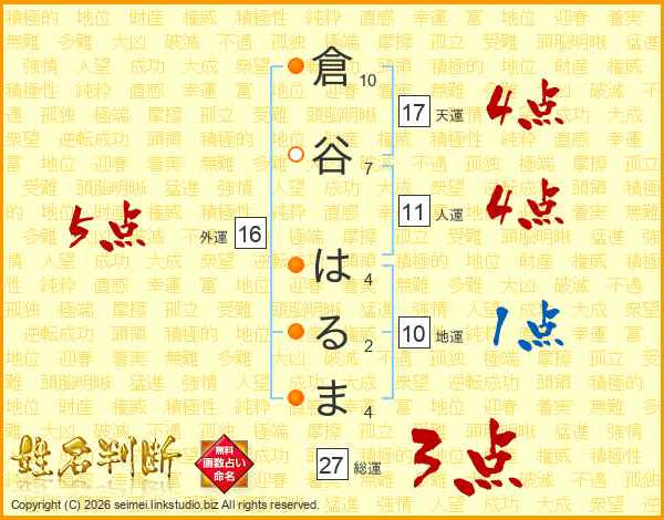 倉谷はるまさんの総運は27画の3点!