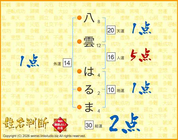八雲はるまさんの総運は30画の2点!