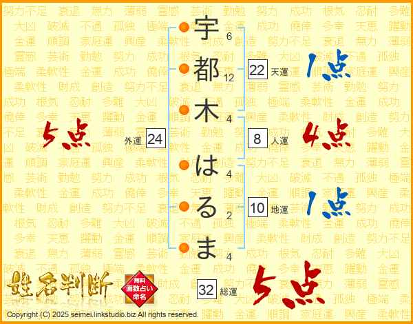宇(6画)都(12画)木(4画) は(4画)る(2画)ま(4画)
