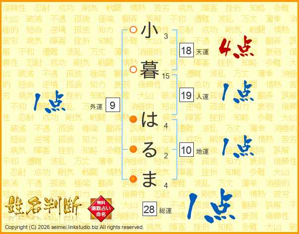 小(3画)暮(15画) は(4画)る(2画)ま(4画)