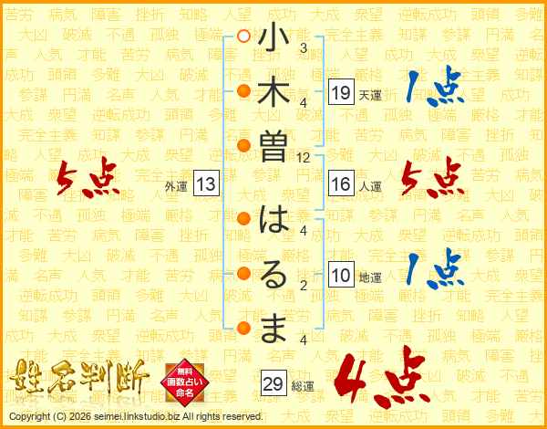 小(3画)木(4画)曽(12画) は(4画)る(2画)ま(4画)