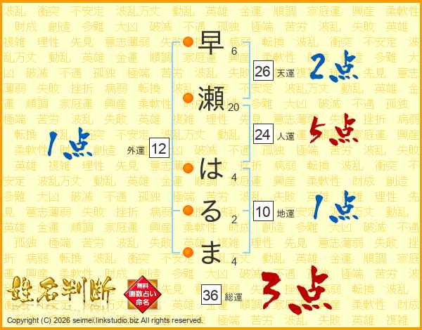 生活面を象徴する運勢です。外部から受ける影響力を表し、結婚運、家庭運や職場、環境への順応性を表します。総運から人運を引いた画数。姓や名が1文字の場合を除く。