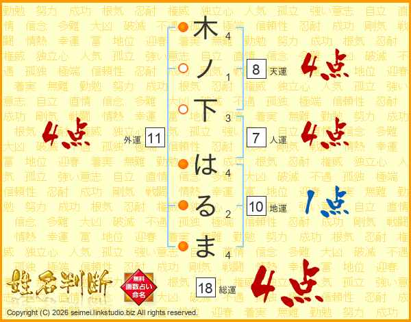 木(4画)ノ(1画)下(3画) は(4画)る(2画)ま(4画)