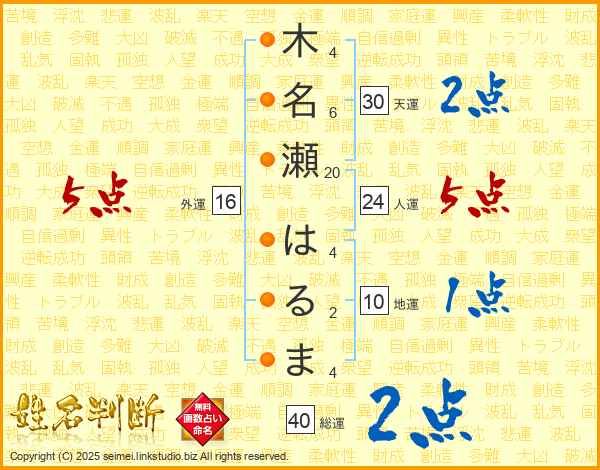 生活面を象徴する運勢です。外部から受ける影響力を表し、結婚運、家庭運や職場、環境への順応性を表します。総運から人運を引いた画数。姓や名が1文字の場合を除く。
