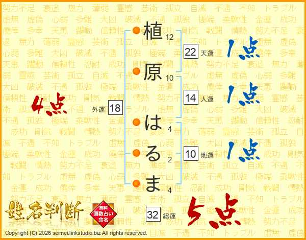 生活面を象徴する運勢です。外部から受ける影響力を表し、結婚運、家庭運や職場、環境への順応性を表します。総運から人運を引いた画数。姓や名が1文字の場合を除く。