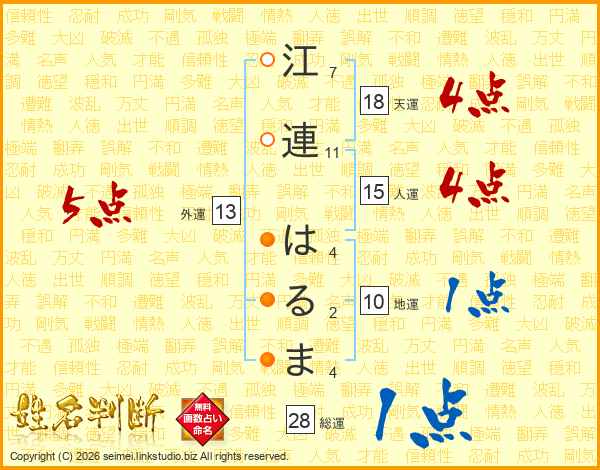 江(7画)連(11画) は(4画)る(2画)ま(4画)