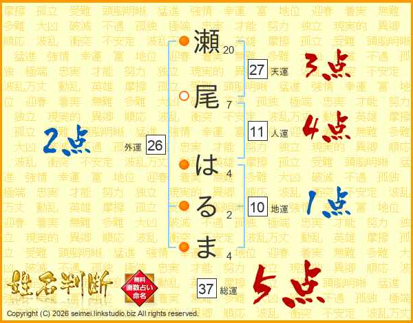瀬(20画)尾(7画) は(4画)る(2画)ま(4画)