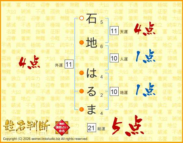 石(5画)地(6画) は(4画)る(2画)ま(4画)