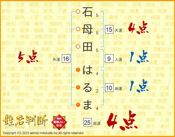 石(5画)母(5画)田(5画) は(4画)る(2画)ま(4画)