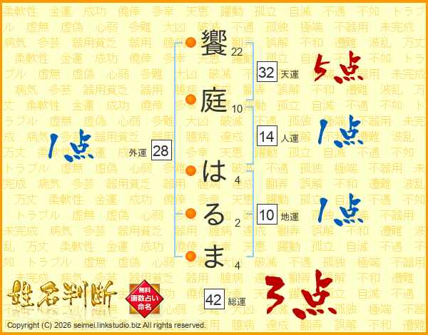 生活面を象徴する運勢です。外部から受ける影響力を表し、結婚運、家庭運や職場、環境への順応性を表します。総運から人運を引いた画数。姓や名が1文字の場合を除く。