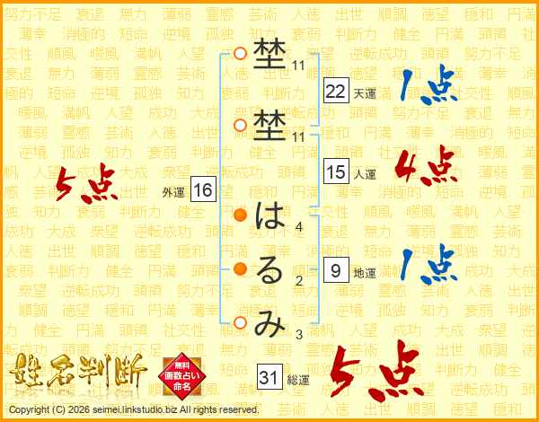 生活面を象徴する運勢です。外部から受ける影響力を表し、結婚運、家庭運や職場、環境への順応性を表します。総運から人運を引いた画数。姓や名が1文字の場合を除く。
