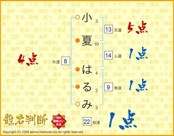 小夏はるみさんの総運は22画の1点!