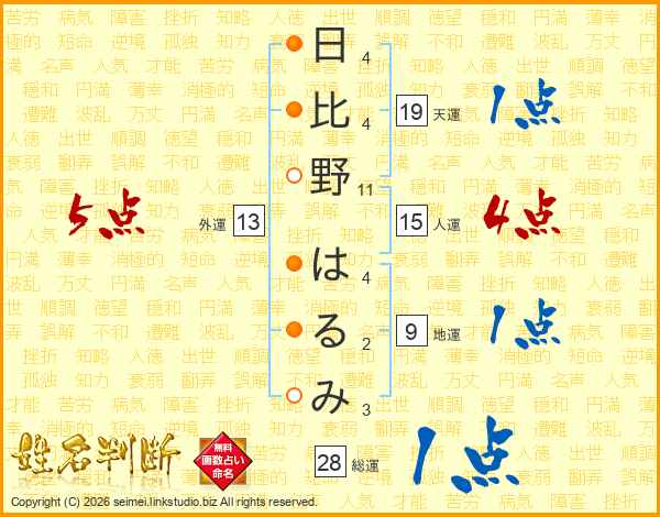 日比野はるみさんの外運は13画の5点!