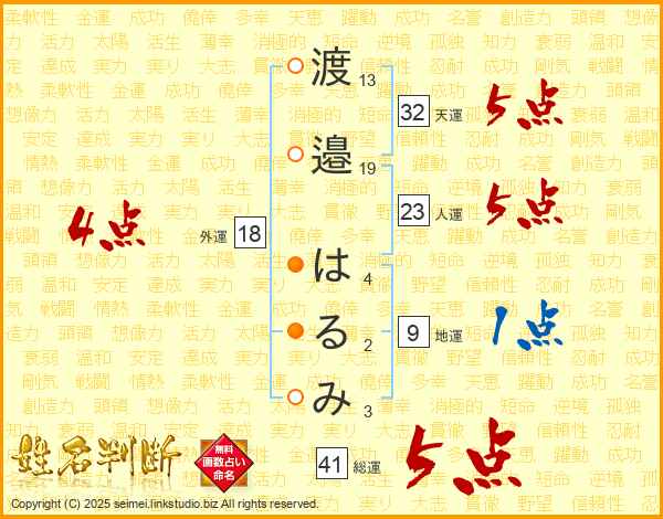 渡(13画)邉(19画) は(4画)る(2画)み(3画)