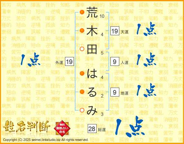 荒(10画)木(4画)田(5画) は(4画)る(2画)み(3画)