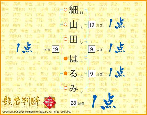 細(11画)山(3画)田(5画) は(4画)る(2画)み(3画)