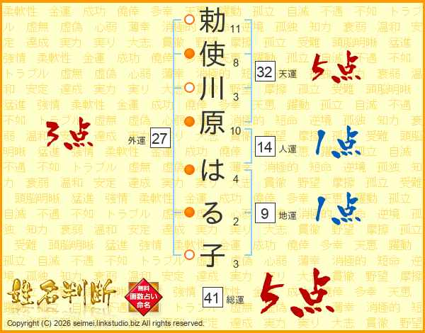 勅使川原はる子さんの総運は41画の5点!
