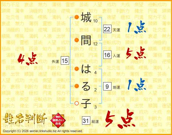 城(10画)間(12画) は(4画)る(2画)子(3画)