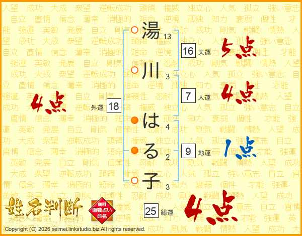 湯川はる子さんの総運は25画の4点!