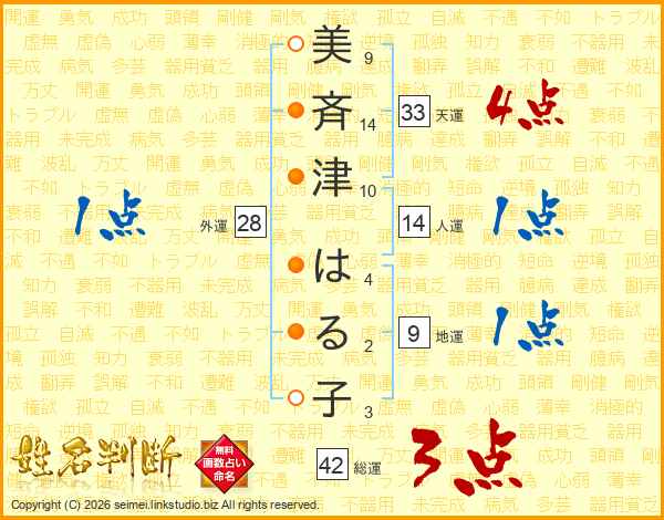 美(9画)斉(14画)津(10画) は(4画)る(2画)子(3画)