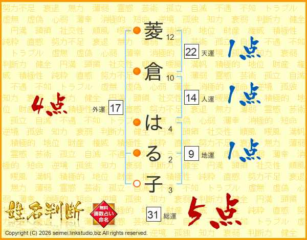 菱(12画)倉(10画) は(4画)る(2画)子(3画)
