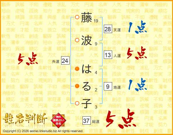 藤(19画)波(9画) は(4画)る(2画)子(3画)