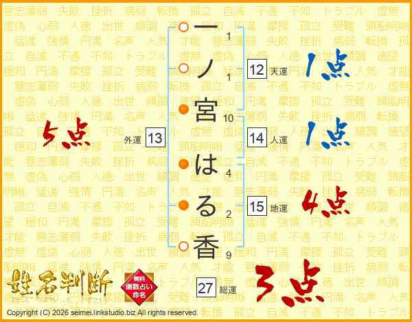 一(1画)ノ(1画)宮(10画) は(4画)る(2画)香(9画)