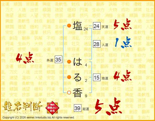 塩(24画) は(4画)る(2画)香(9画)