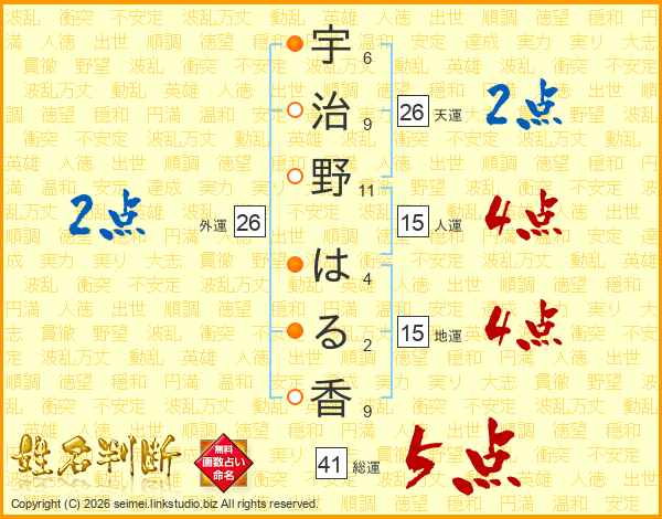 宇(6画)治(9画)野(11画) は(4画)る(2画)香(9画)
