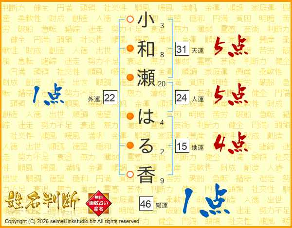 小和瀬はる香さんの総運は46画の1点!