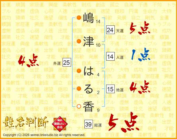 嶋(14画)津(10画) は(4画)る(2画)香(9画)