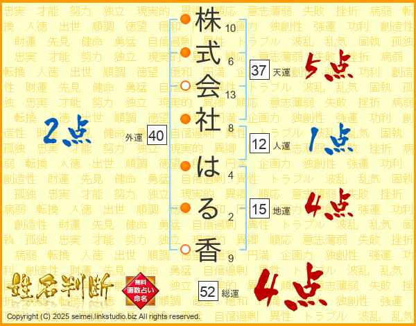 株(10画)式(6画)会(13画)社(8画) は(4画)る(2画)香(9画)