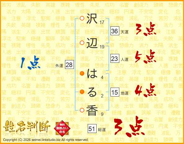 沢(17画)辺(19画) は(4画)る(2画)香(9画)
