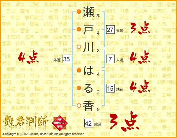 瀬(20画)戸(4画)川(3画) は(4画)る(2画)香(9画)