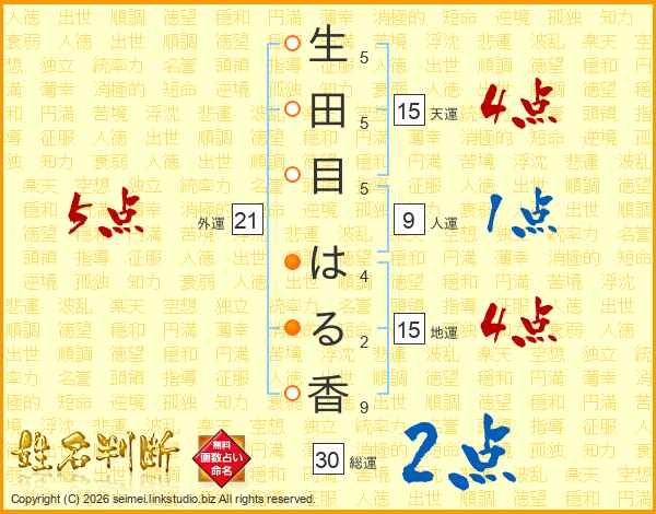 生(5画)田(5画)目(5画) は(4画)る(2画)香(9画)