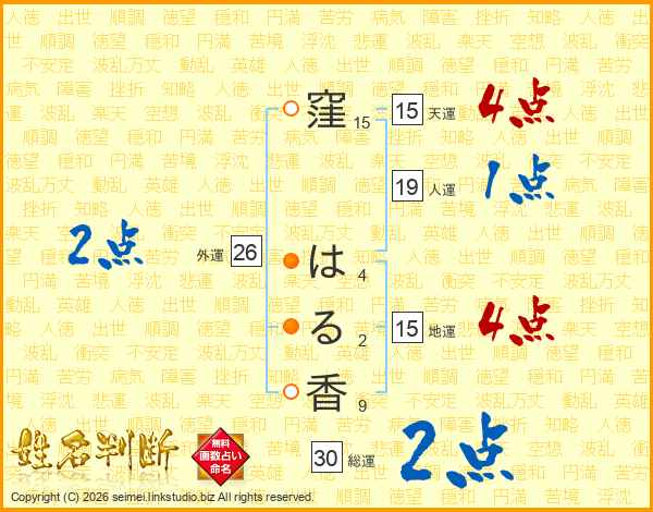 生活面を象徴する運勢です。外部から受ける影響力を表し、結婚運、家庭運や職場、環境への順応性を表します。総運から人運を引いた画数。姓や名が1文字の場合を除く。
