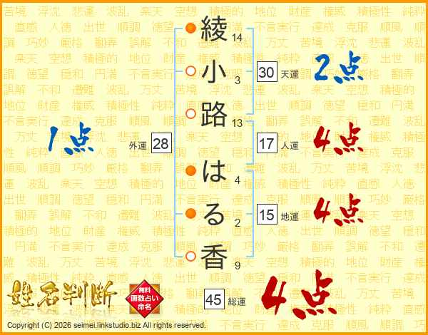 綾小路はる香さんの総運は45画の4点!