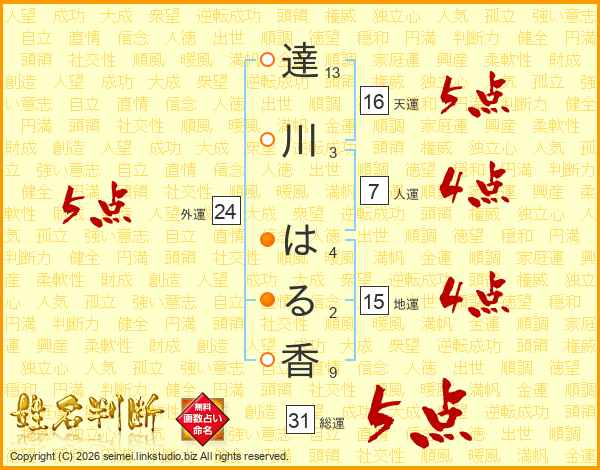 達(13画)川(3画) は(4画)る(2画)香(9画)