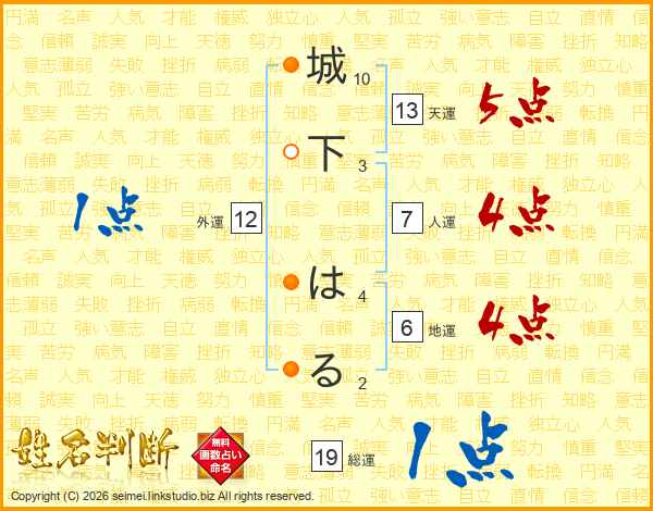 生活面を象徴する運勢です。外部から受ける影響力を表し、結婚運、家庭運や職場、環境への順応性を表します。総運から人運を引いた画数。姓や名が1文字の場合を除く。