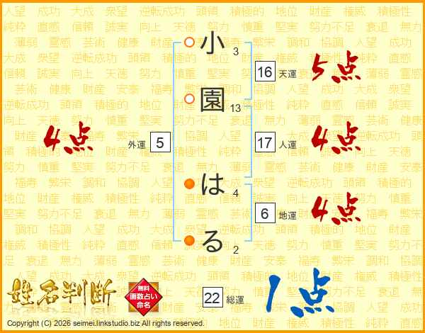 生活面を象徴する運勢です。外部から受ける影響力を表し、結婚運、家庭運や職場、環境への順応性を表します。総運から人運を引いた画数。姓や名が1文字の場合を除く。