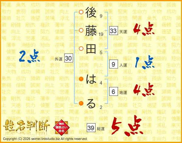 後藤田はるさんの総運は39画の5点!