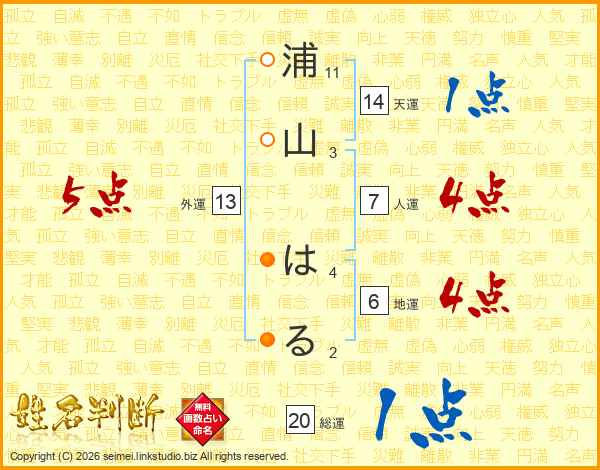 生活面を象徴する運勢です。外部から受ける影響力を表し、結婚運、家庭運や職場、環境への順応性を表します。総運から人運を引いた画数。姓や名が1文字の場合を除く。