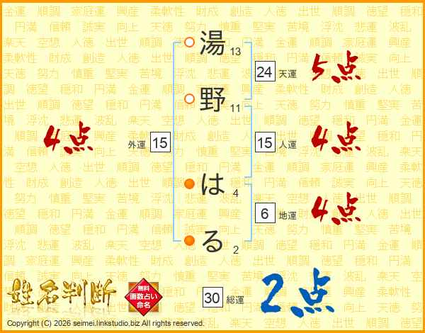 湯野はるさんの総運は30画の2点!
