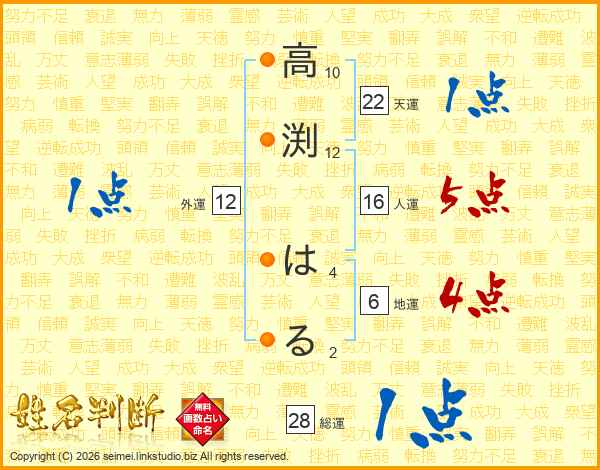 高渕はるさんの総運は28画の1点!