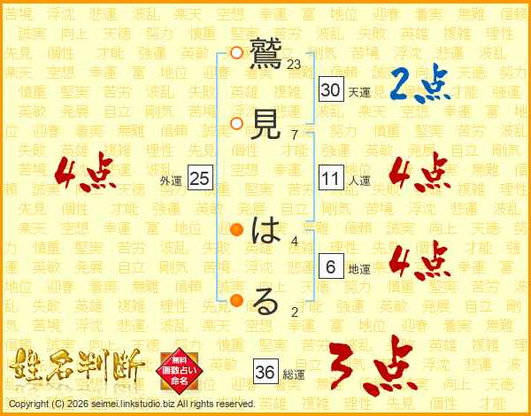 あなたの人生を表す1番重要な運勢です。生涯を通じて影響する総合運となり、主に50歳以降の晩年期に影響を及ぼします。苗字と名前の合計画数。