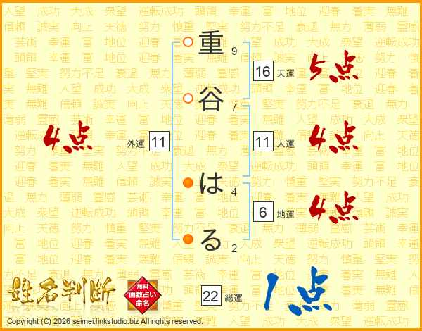 重谷はるさんの総運は22画の1点!