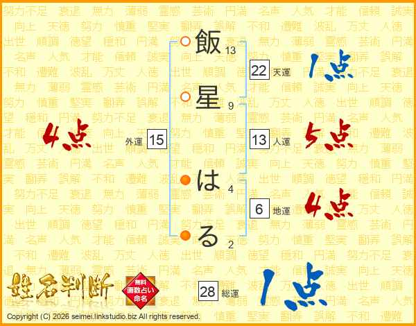 生活面を象徴する運勢です。外部から受ける影響力を表し、結婚運、家庭運や職場、環境への順応性を表します。総運から人運を引いた画数。姓や名が1文字の場合を除く。