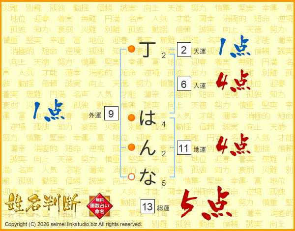 丁はんなさんの総運は13画の5点!